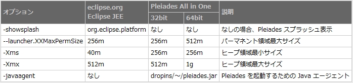 -XX:MaxPermSize ではなく --launcher.XXMaxPermSize で指定しているのは、-XX:MaxPermSize が Sun JVM の拡張オプションであり、それ以外の JVM では起動できない場合があるためです。 Eclipse ではその問題を回避するために、--launcher.XXMaxPermSize が指定された場合、JVM ランチャーである eclipse.exe が Sun JVM に -XX:MaxPermSize を渡し、それ以外の JVM には何も渡しません。IBM JVM はパーマネント領域は自動制御されるため指定する必要がなく、JRockit ではパーマネント領域ではなくネイティブ領域 (物理メモリ - ヒープ) にクラス情報が格納されます。